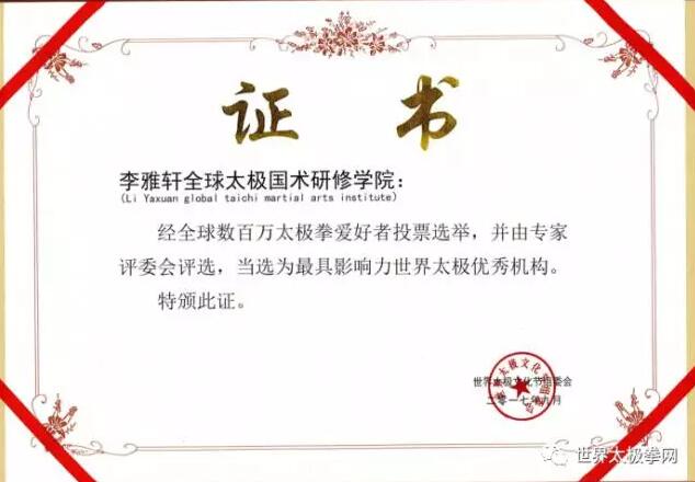 基于在世界上良好的影响力,大会组委会向李雅轩全球太极国术研修学院颁发了“最具影响力世界太极优秀机构”的荣誉奖项,以表彰学院在培养太极人才,弘扬太极文化事业中所做出的突出贡献。
