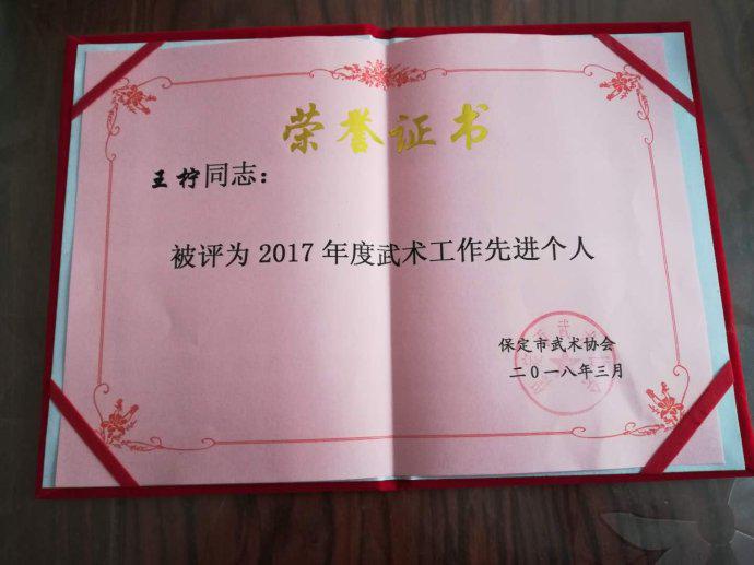 【涿州分会会员 王柠】:被保定市武术协会评为“2017年度武术工作先进个人”。
