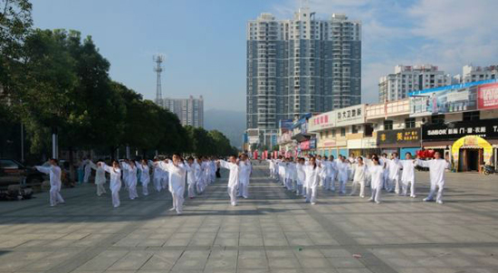 随着全民健身活动的广泛开展,太极拳越来越被广大城乡居民所接受和喜爱。起式、野马分鬃、白鹤亮翅、搂膝拗步、手挥琵琶、左揽雀尾……会同县二完小操场,在舒缓的乐曲中,70余名统一着装的老师们在教练的示范下认真地练习太极套路,成为全民健身运动的一道风景。