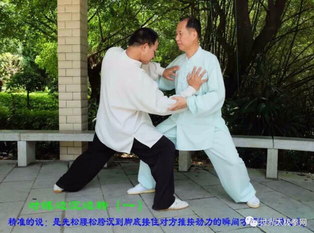 不少人应对前推胸膛没问题,应对后扒肩背就出现轻则站不稳重则失重跌出去了,这是守桩的实际问题之一,所以在此介绍应对扒背的练法与要领:1、对方推我的双手伸出还没到我肩背时,我以松腰、落胯(指承载体重七成的前实腿)、塌胯(指承载体重三成的后虚腿)的正身弓步准备到位待扒。前腿胫骨垂直于地面,脚跟吃劲七成,脚掌吃劲三成;后腿髋、膝、踝节节贯串的松开伸直,脚跟吃劲六成,脚掌吃劲四成。2、对方推我的双手接触到我肩背的瞬间,我意念肩背与前腿脚底上下贯通的接劲,换句话说,就是意念对方把双手接触到我肩背的一点劲力卸到前腿脚底地面。尽管此时对方还没出较大劲力来推,我是要以接触对方双手的桡骨(位于前臂外侧)听劲和肩背接触对方双手的听劲,早一点吃准对方欲来劲力,大意不得,但也不用过于紧张。3、对方扒我肩背的双手开始出大劲力时,我松腰后腿塌胯、托胯下沉撑脚的同时前腿落胯撑脚,此时是身体垂直松沉之势又是前脚底撑胯之势。对方扒我劲力加大一点,我就下沉多一点、前脚底撑胯劲多一点、后脚底撑胯劲多一点、肩背往前虚让一点(腰部沉直为实,胸椎稍弯为虚);相对吃劲受力而言,是前脚实后脚虚的态势,要尽量做到恰到好处。再有越是吃劲受力,越是要注意加强檀中穴、腰椎与会阴穴垂直于地面,腰的塌而沉力不够、腰不正直是守桩的较大拳病。